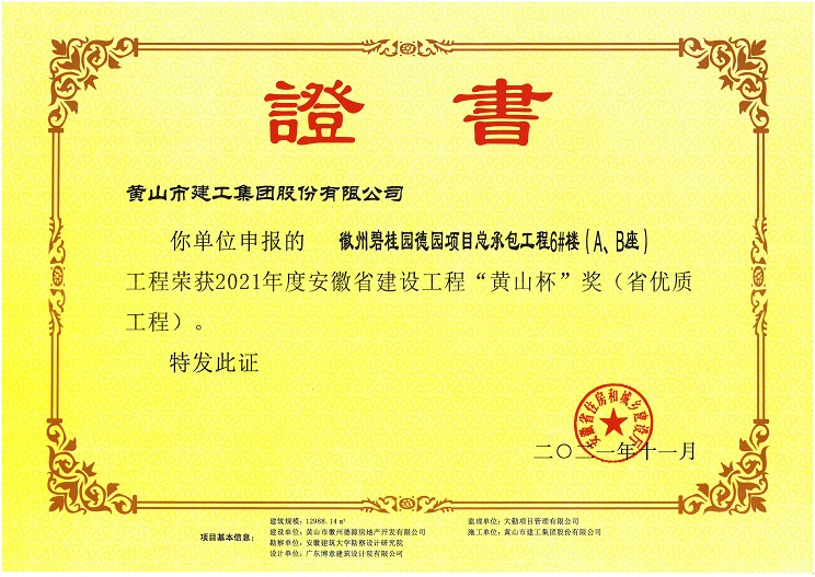 由华体会体育官方网站-华体会体育(中国) 承建的徽州区碧桂园德园项目总承包工程6#楼(A、B座) 工程荣获安徽省工程质量最高奖“黄山杯”奖。该工程在开工伊始,项目部就制订了创优目标,严格过程控制,建立健全项目质量管理体系,狠抓现场施工管理,把好施工过程质量控制关,为创精品工程打下坚实的基础。