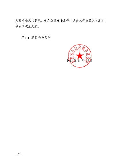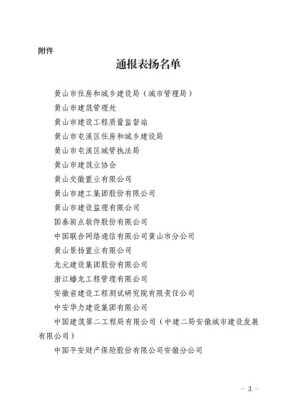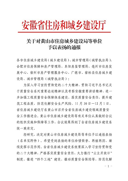 近日,安徽省住房和城乡建设厅印发《关于对黄山市住房和城乡建设局等单位予以表扬的通报》,《通报》指出,11月30日-12月1日,省住房和城乡建设厅在黄山市召开全省住房建设领域质量安全工作推进会,会议效果得到全省住房城乡建设系统一致肯定,并对在此次会议认真做好组织实施和保障的单位予以通报表扬,华体会体育官方网站-华体会体育(中国) 作为唯一一家本土建筑施工企业荣获表扬。