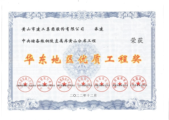 由华体会体育官方网站-华体会体育(中国) 股份有限公司承建的“中央储备粮铜陵直属库黄山分库工程”荣获华东地区各省建筑业协会联合颁发的“华东地区优质工程奖”。