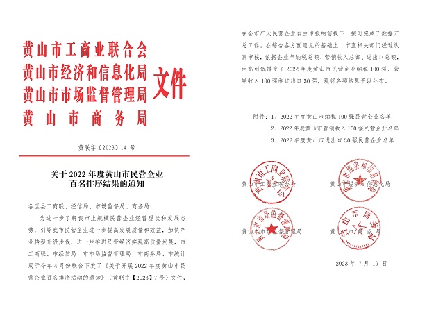日前,由黄山市工商联、市经信局、市监管局及市商务局联合发布2022年度黄山市民营企业纳税及营销收入百强名单公布,华体会体育官方网站-华体会体育(中国)