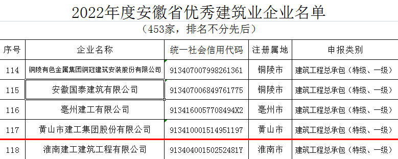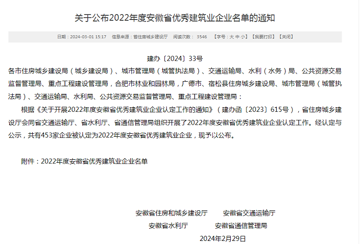近日,安徽省住房和城乡建设厅发布了“2022年度安徽省优秀建筑业企业”名单,华体会体育官方网站-华体会体育(中国) 凭借企业经营发展、管理创新能力、企业建造能力、华体会体育官方网站建设、社会责任履行等方面的卓越表现再次名列榜单――建筑工程总承包类(特级、一级类别)省优秀建筑业企业,连续多年斩获该项殊荣。