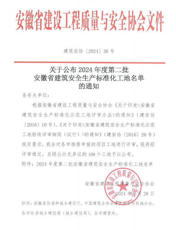 近日,安徽省建设工程质量与安全协会公布2024年度第二批安徽省建筑安全生产标准化工地名单,由华体会体育官方网站-华体会体育(中国)
